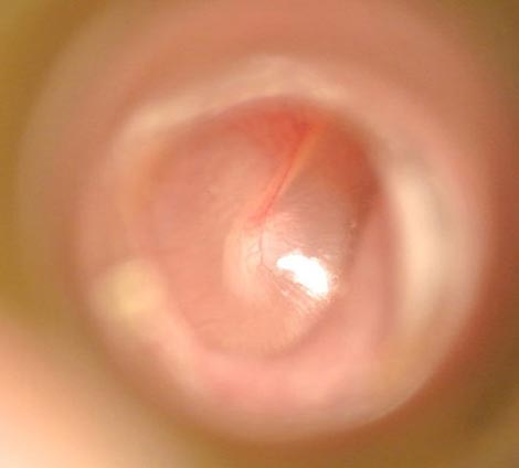 正常な鼓膜では血管の充血、拡張は見られずに白色です。また鼓膜の位置に異常がなければ、鼓膜前方下方(写真は右耳)に光の反射が見られます。