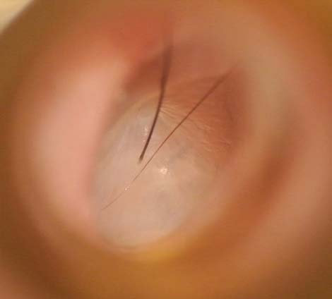 髪の毛が二本外耳道に入り、鼓膜に接触しています。この様な些細な異物でも、鼓膜に接していると口を開け閉めしたり、首を動かした際に大きなガサガサと異音を感じます。
