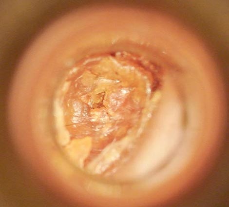 湿性耳垢と呼ばれる湿ったタイプの耳垢が外耳道を完全に閉鎖しています。ここまで詰まると聴力が低下します。