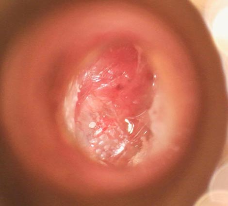 中等度の穿孔から発赤した炎症を起こし始めた中耳粘膜が見えます。
