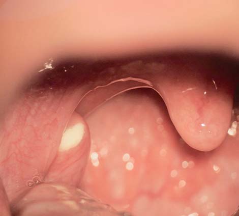 さらに進行すると、粘膜全体に発赤と腫脹が強くなります。 扁桃にも少し白い膿(写真右)がつき始めています。